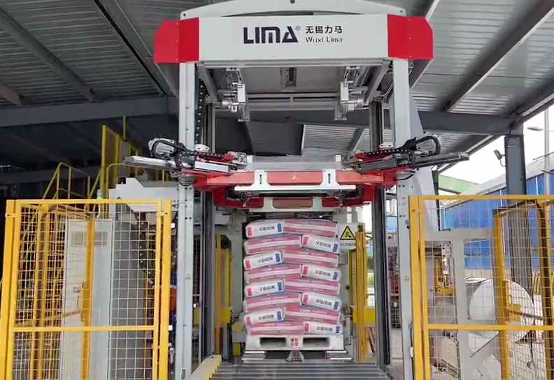 La línea completa consta de varios componentes clave, incluida la máquina ensacadora automática, la volteadora de bolsas, el detector de metales, la controladora de peso, el transportador de rechazo, la paletizadora automática, y el transportador de paletas.